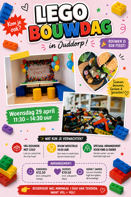 Bouwen met Lego is een feest! Om 14.00 start een heuse bouwwedstrijd. Reserveer wel minimaal 1 dag van tevoren want vol=vol! Deelname voor kinderen is incl. siroop en voor volwassenen incl. thee.